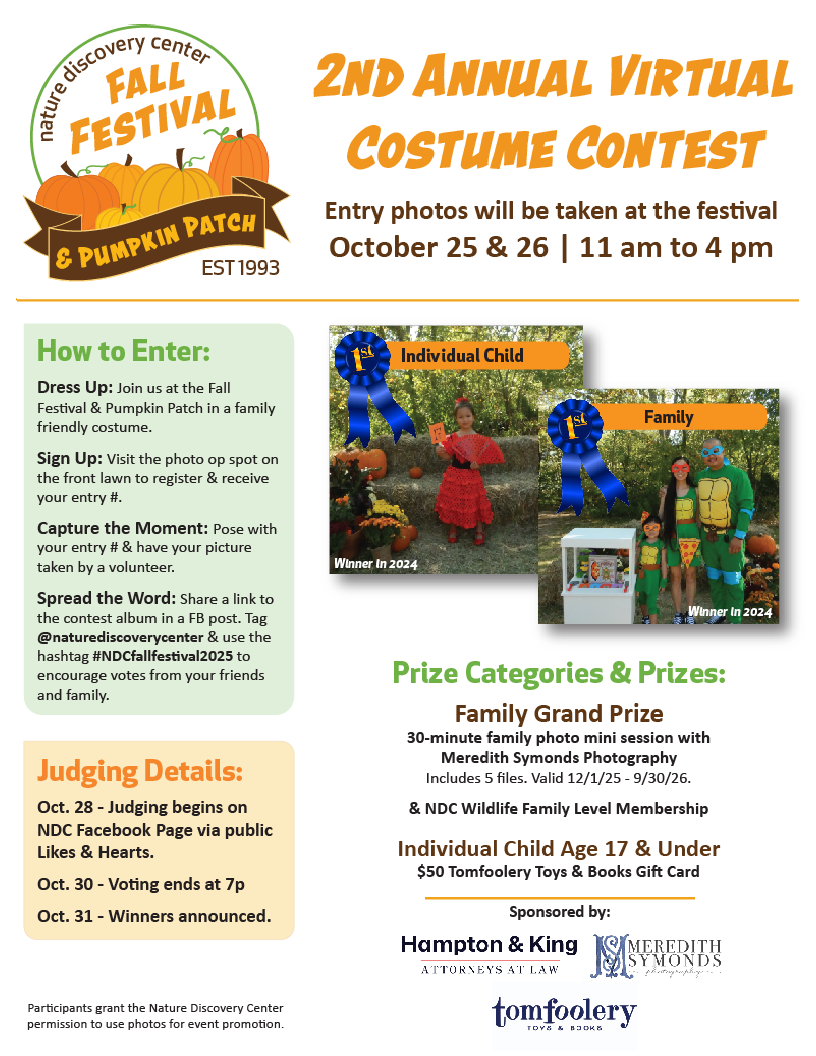 Note: We will not offer refunds for Activity Wristbands, Wagon Load time Tickets, pumpkins, or other items purchased at the festival. Your festival purchases are considered a donation toward general operations of the Nature Discovery Center, a 501(c)(3) nonprofit organization. We thank you for your support!